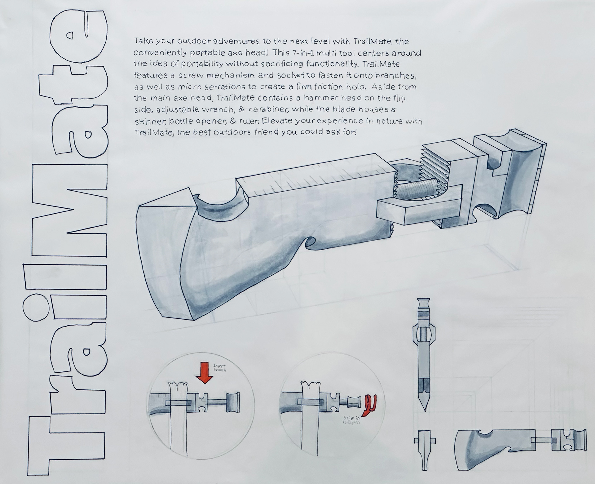 TrailMate, Original axe head multi-tool concepted, blueprinted, and marker rendered using pencil, liner, and alcohol marker on bristol board (blueprint) and vellum (render), 2025.